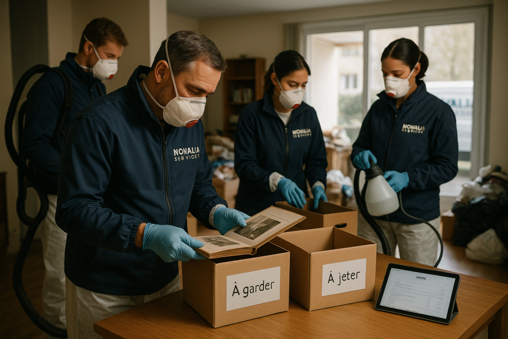 - Protocole complet : débarras → tri → désencombrement → nettoyage → dégraissage → traitement des odeurs → désinfection → remise en état.