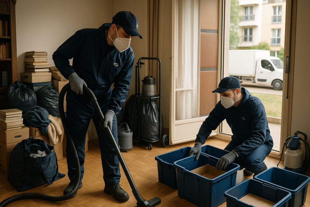 Matériel et produits : aspirateur HEPA, EPI complets (combinaison, gants, masque FFP3), bacs de tri, nébuliseur, désinfectants homologués EN, produits dégraissants professionnels. Si la situation le nécessite, un protocole de protection spécifique et une décontamination complète sont mis en place.