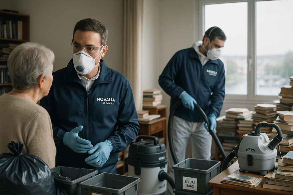 Q3 — Travaillez-vous sans sous-traiter dans le Val-d’Oise ? A3 — Oui : pas de sous-traitance. Nos salariés NOVALIA réalisent toutes les étapes (tri, débarras, désinfection).